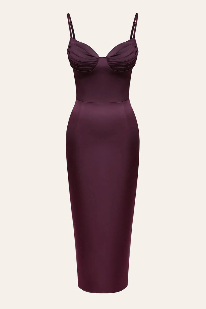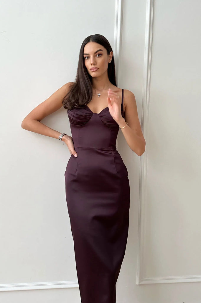 Elegant, sophisticated satin dress with thin straps is ideal for creating a feminine look. The V-neck and frill cups accentuate the chest line and the midi length balances the whole design look. Complete the outfit with shoes or stiletto sandals.