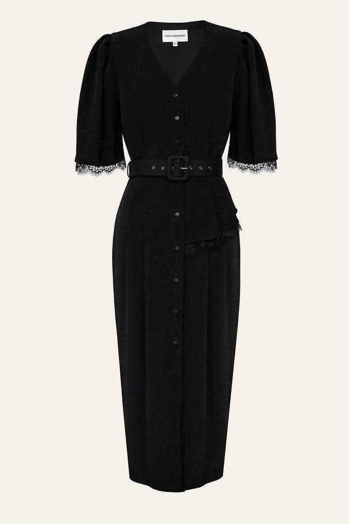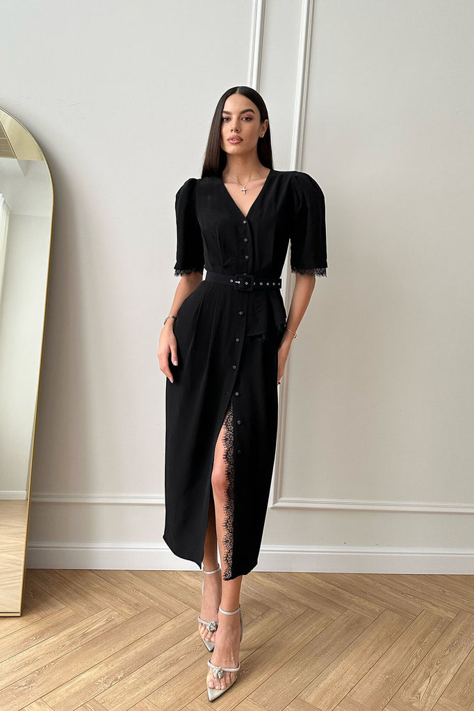 The dress aesthetic is all about evoking nostalgia and femininity. Midi length dress with buttons. Delicate lace trim on the sleeves and skirt add romantic notes. The elegant V-neck accentuates the neck and collarbones.