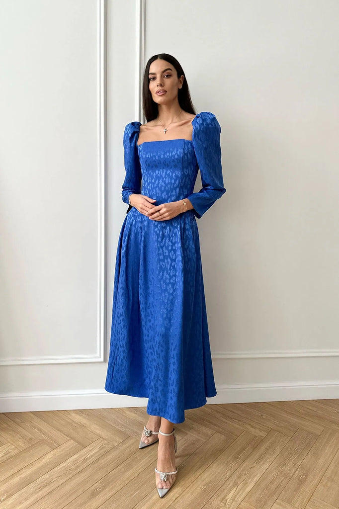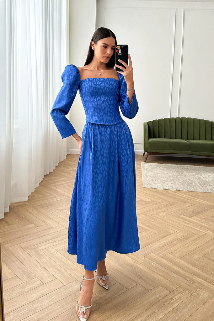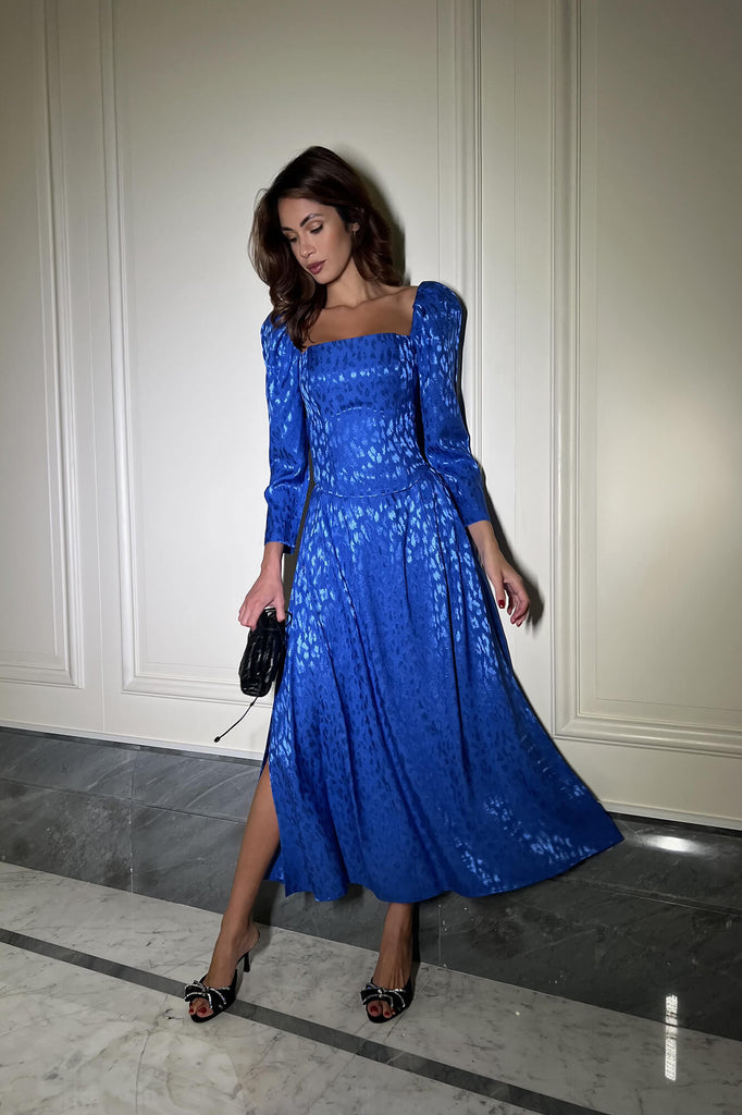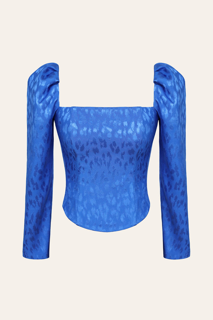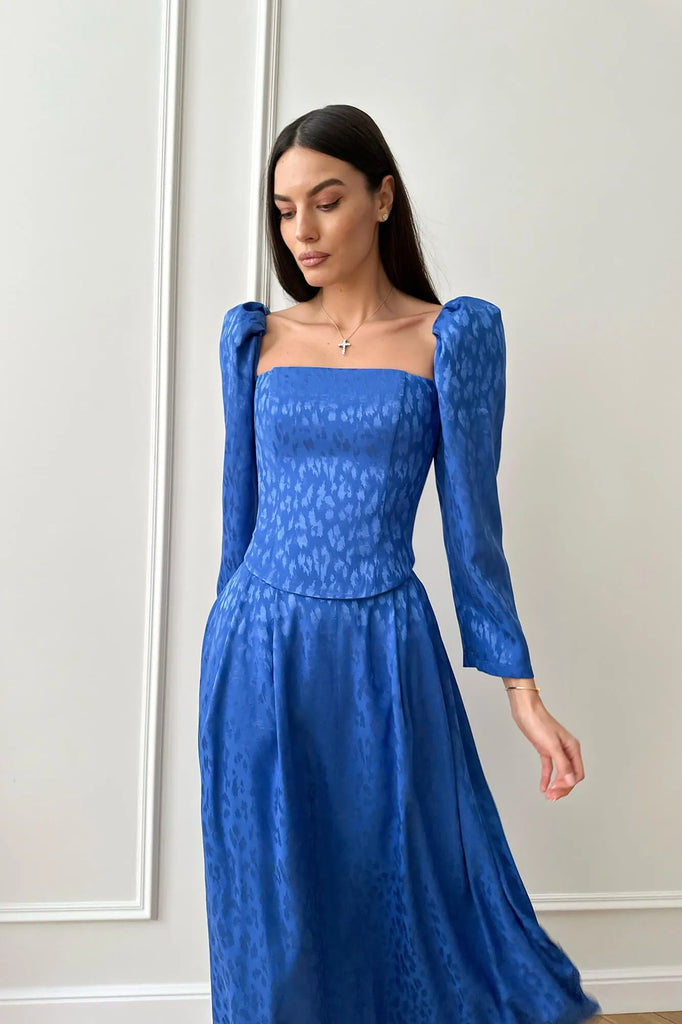 A long sleeve top in the deep blue color made of textured viscose. The corset base provides a perfect fit and models the figure and the deep square neckline opens the neck and collarbones. To create a spectacular evening outfit сomplete it with a top from our collection.