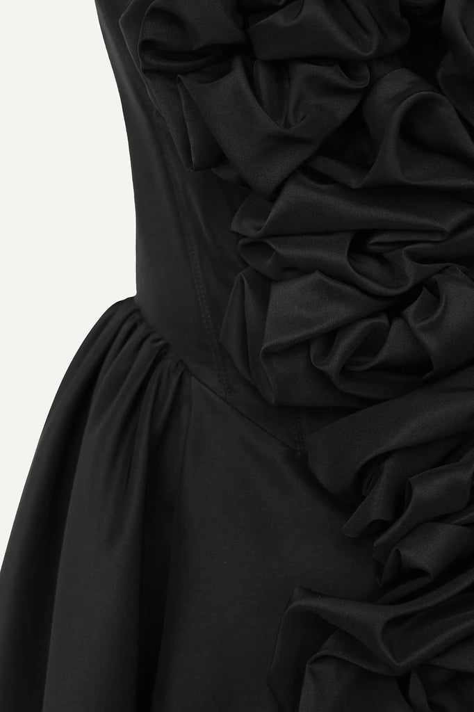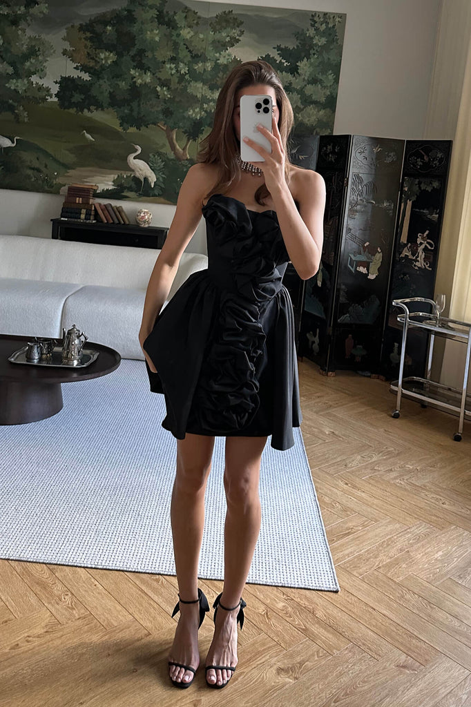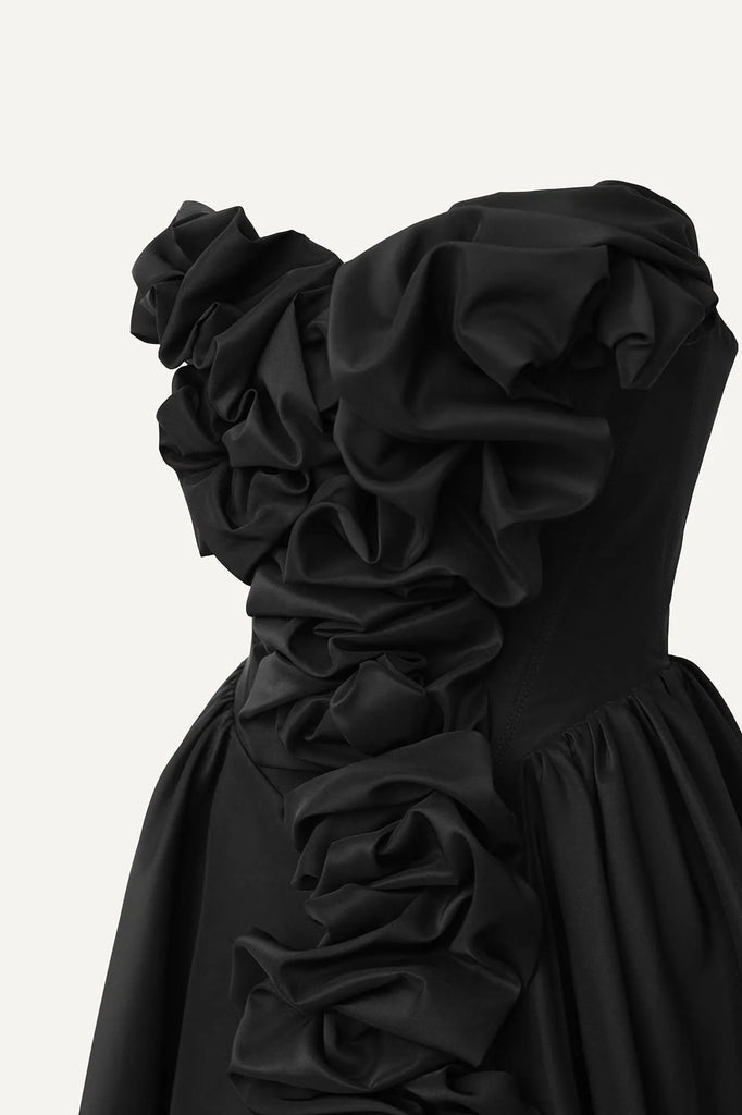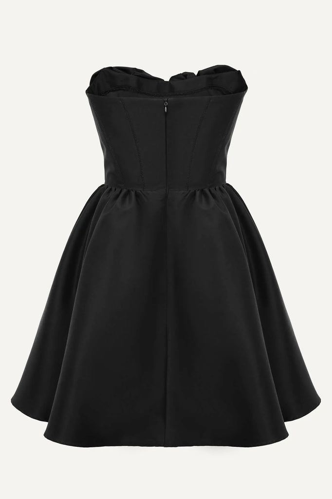 An airy satin bustier dress in a in elegant black. Decorative gathers on the bodice and skirt make the look playful and feminine. A soft corset bodice without cups perfectly shapes the figure, emphasizing the neckline and shoulders, and a fluffy mini skirt will allow you to demonstrate all the beauty of your legs. A hidden zipper on the back in the middle seam. A fly-away lining on the skirt.
