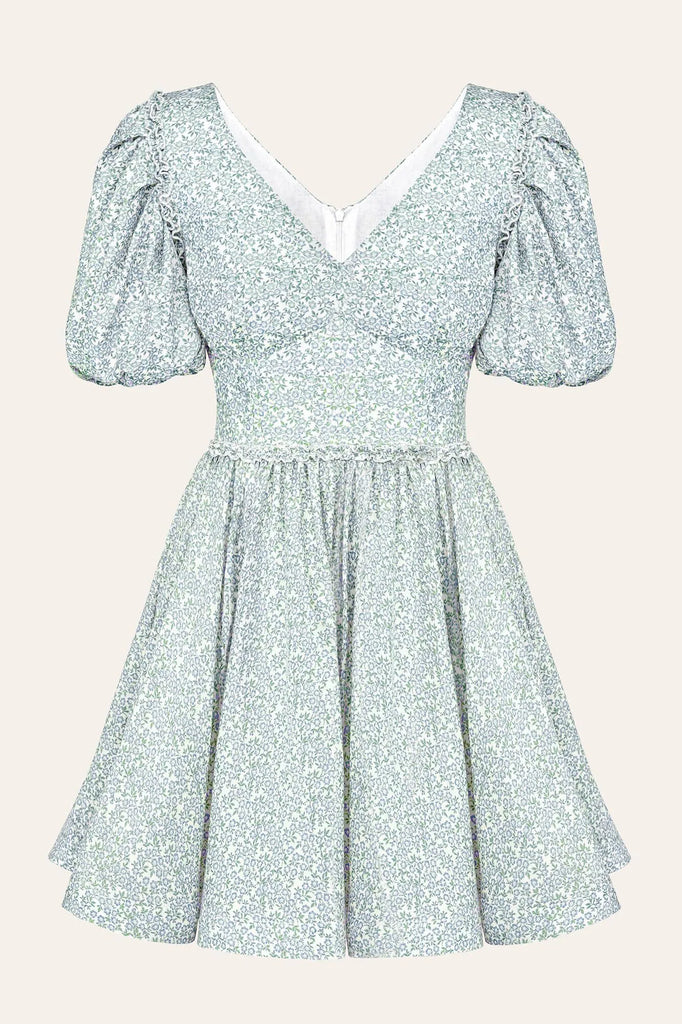 A Summer Mini Floral Dress in blue shades. The V-neck emphasizes the neck and collarbones. A full skirt, lantern sleeves and decorative ruffles along the waist and armholes give a feeling of summer playfulness and tender femininity. The fabric combination of viscose and cotton makes this garment super comfortable to wear even on the hottest day.