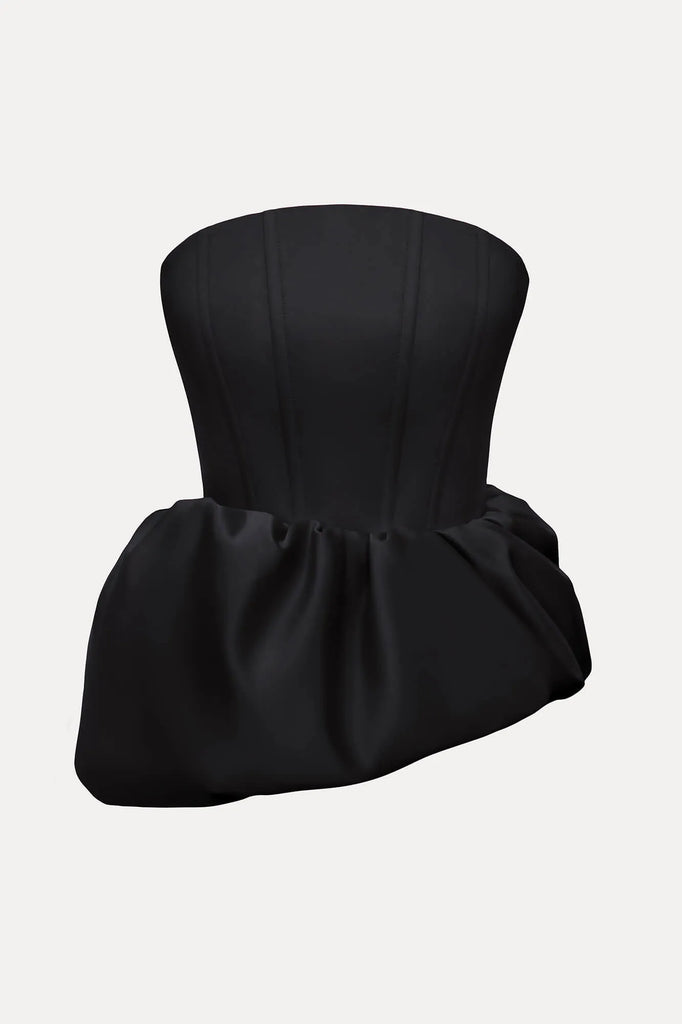 This luxurious corset top is crafted from opulent satin, creating a deep, rich color with a delicate sheen. The close-fitting design accentuates the feminine silhouette, creating a beautifully flattering shape. A dramatic, gathered basque adds volume and a touch of exquisite detail. The strapless design showcases the shoulders, adding a touch of effortless elegance. Ideal for evening events and celebrations.