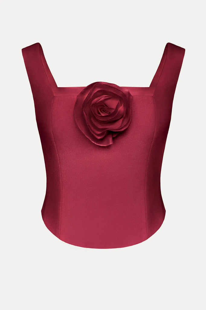 A crop top in Vinous with a square neckline and wide straps. Removable rose decor add tenderness and romance to the look. Fits perfectly to the bodyshape. Mix it with High Waisted Trousers or Midi Skirts. Lined.