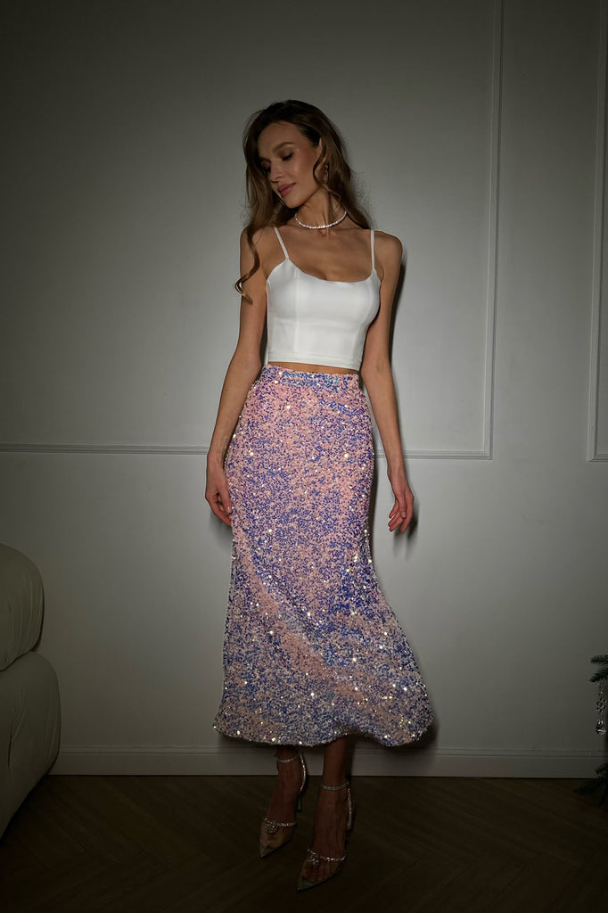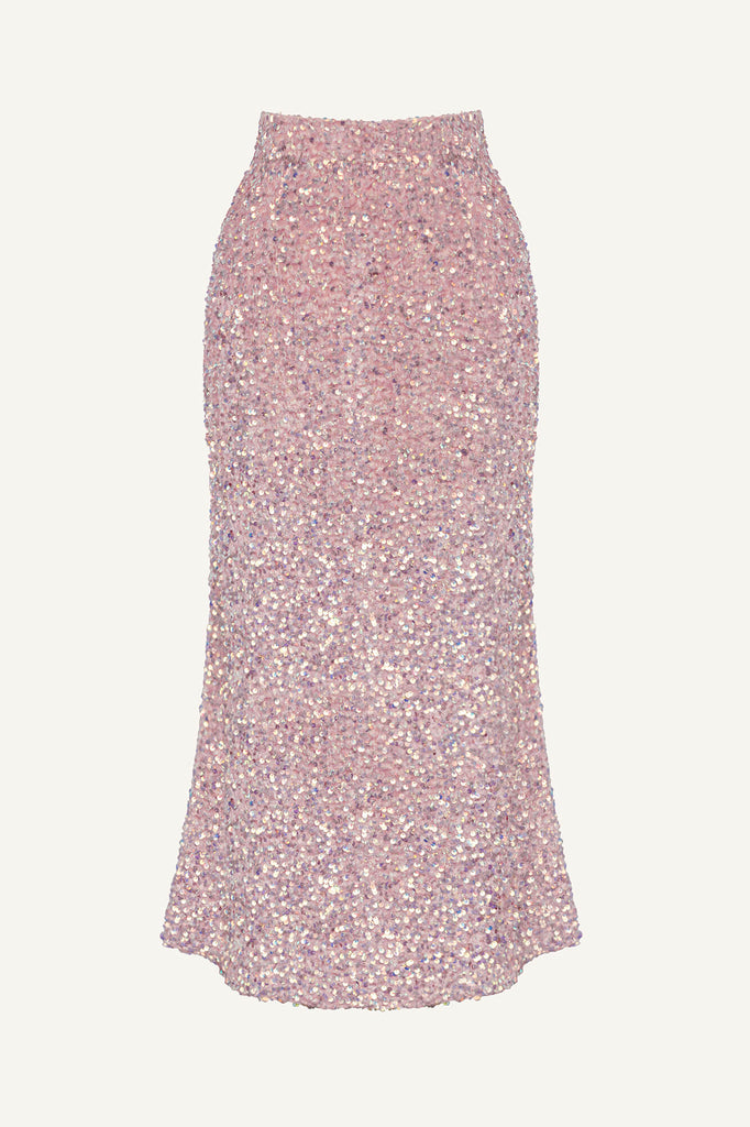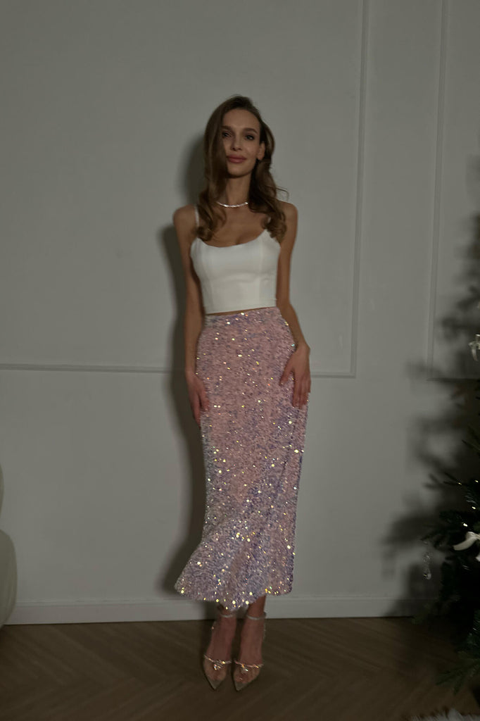Godet skirt in midi length in light pink color. Fitted silhouette flares downwards. Sequins embroidered sparkling fabric looks spectacular and luxurious. Invisible zipper fastener.