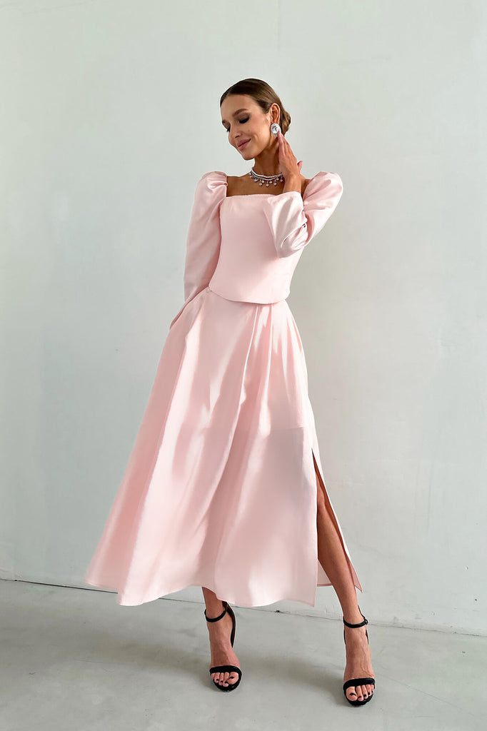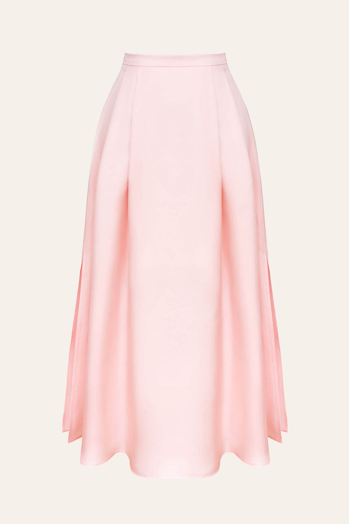 A fluffy midi-length skirt in tender pink made of natural silk. The side slits make it easy to move and add a little zest. To create a spectacular evening outfit сomplete it with a top from our collection.