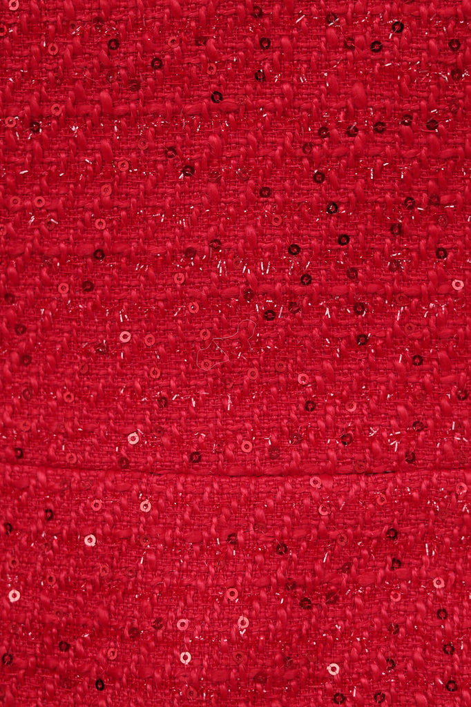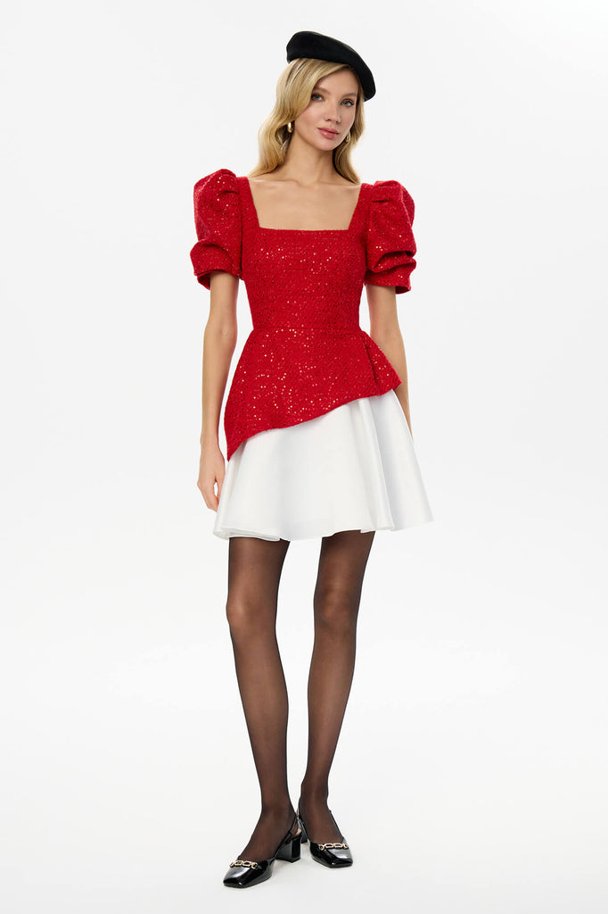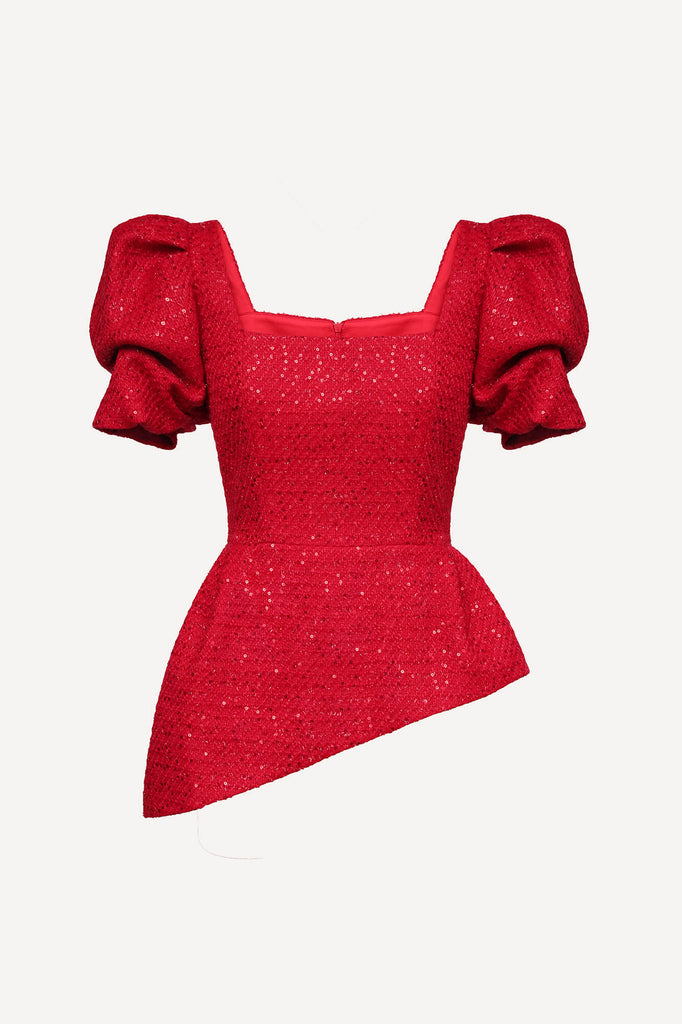 The square-neck top with voluminous draped sleeves is crafted from tweed fabric embellished with sequins. The square neckline accentuates the décolletage and visually elongates the neck, while the billowy sleeves create a striking focal point, adding femininity and sophistication to the look. The asymmetrical peplum gently flares, giving the silhouette a bold and expressive touch. This top is perfect for evening events or special occasions.