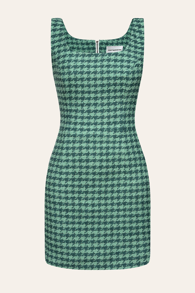 The houndstooth dress made of tweed fabric in green shades. This silhouetted dress in mini-length creates perefect day-to-night elegant look. Lined.